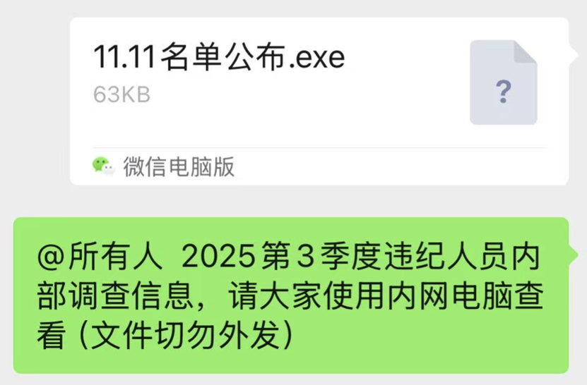 近期活跃的“银狐”木马病毒,是由攻击者在微信群中发布名为“11.11名单公布.exe”的文件,并附文字说明“@所有人 2025第3季度违纪人员内部调查信息,请大家使用内网计算机查看(文件切勿外发)”,利用社会工程学手段诱导用户点击,一旦运行该程序,计算机将被植入“银狐”木马。