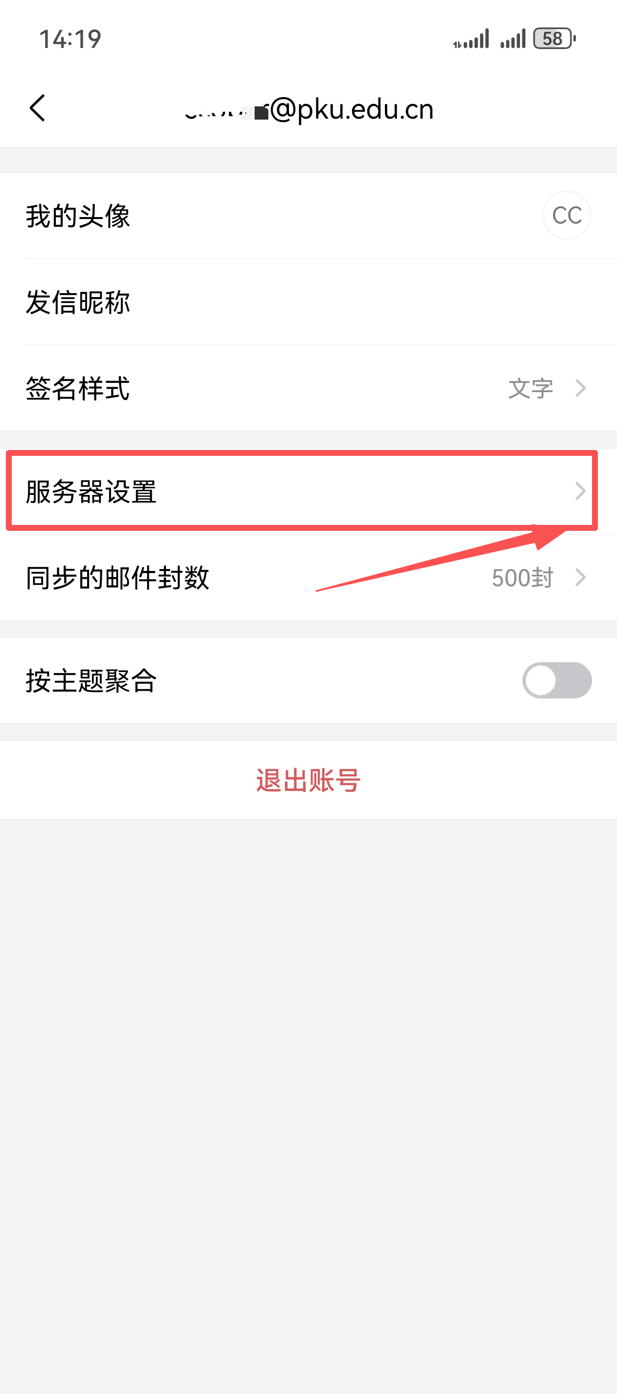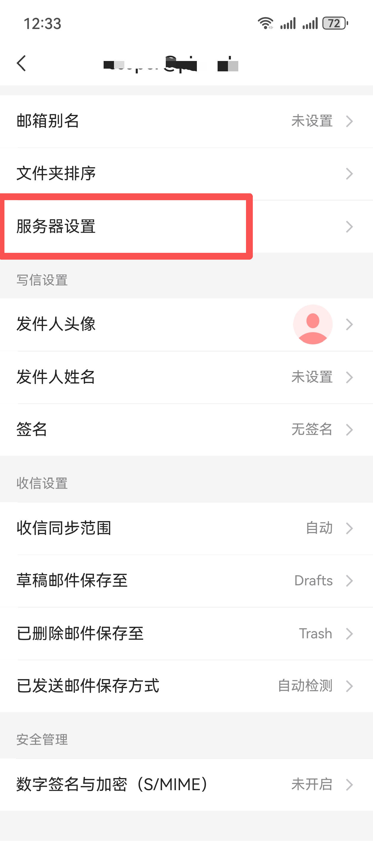 在"帐户"中打开需要修改的账户,在"服务器设置"中更新密码(华为手机不允许粘贴密码,只能输入16个字母和数字,其中空格不需要输入,注意大小写要正确)。