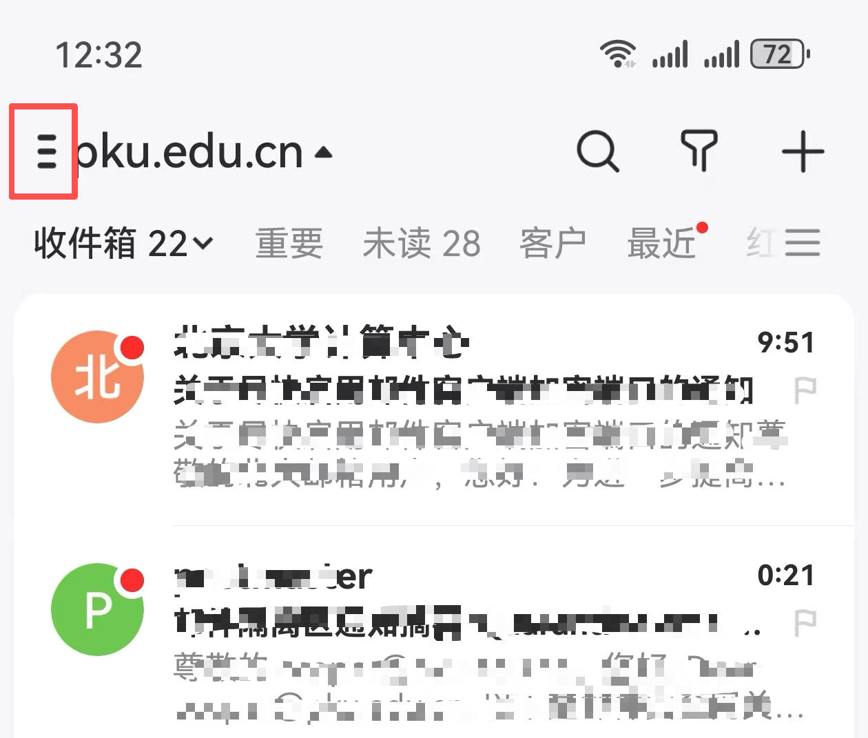 以下列出几种常用客户端修改密码的方法,以@pku.edu.cn邮箱为例,院系邮箱可参考操作。注意只需将密码改为客户端专用密码就可以了,其他配置不需要改动: