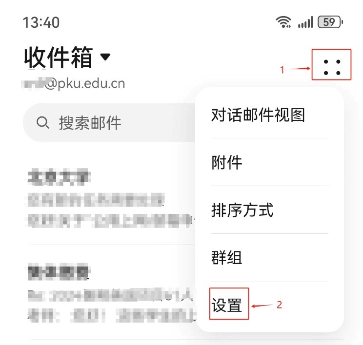 1. 打开邮件App,点右上角四个点的图标,再点“设置”:
