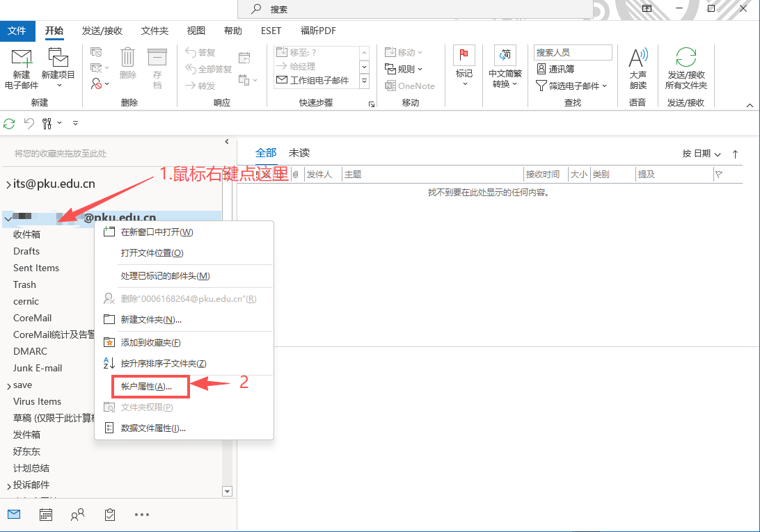 1. 打开outlook,在邮箱账号名称上,点鼠标右键,选“帐户属性”: