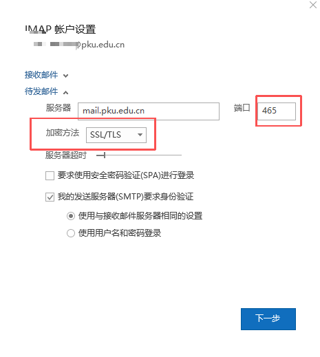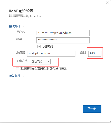 4. 修改“接收邮件”的端口和加密方法,IMAP账户端口号改为993,POP3账户端口号改为995,加密方法选“SSL/TLS"
