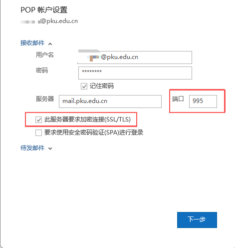 “收件设置”一栏,确认勾选“使用SSL”,服务器端口为995即可。